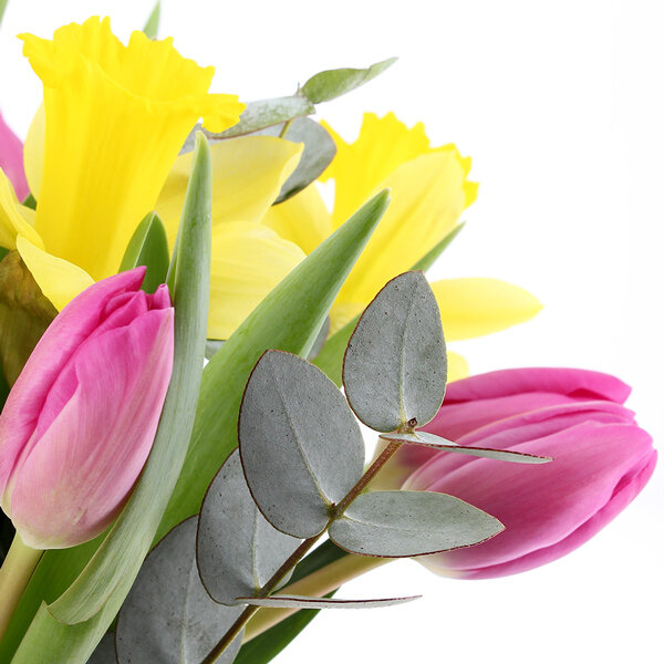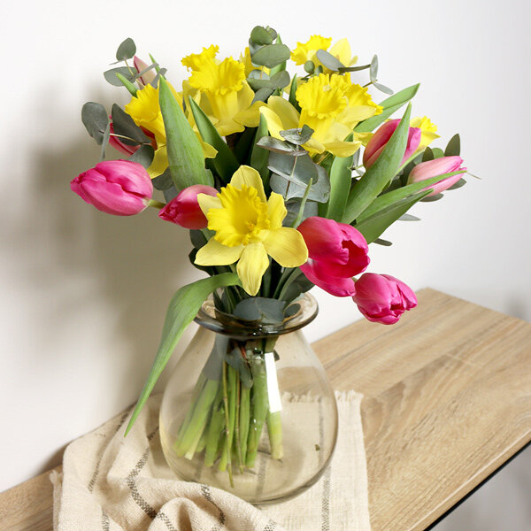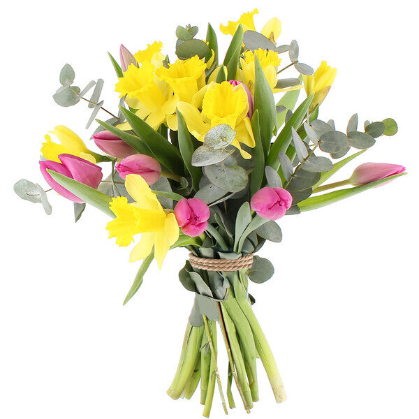 Du jaune qui chante, du rose qui murmure, Soleis réunit deux fleurs emblématiques du printemps dans un seul bouquet généreux. Dix tulipes roses aux pétales soyeux côtoient dix grandes jonquilles dorées, rehaussées d'un feuillage d'eucalyptus pour apporter volume et fraîcheur. Ensemble, ils forment une composition lumineuse qui fait entrer la saison dans n'importe quelle pièce, avant même que le soleil s'en charge.