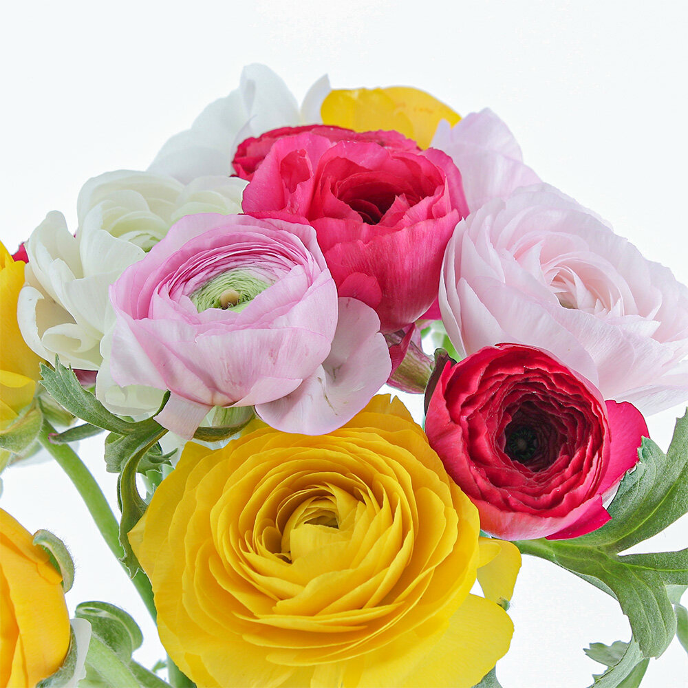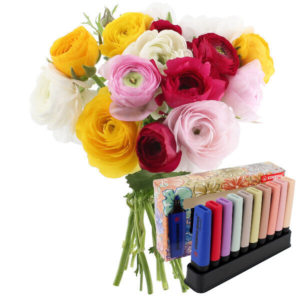 Le bouquet réunit 15 renoncules dans un camaïeu vibrant qui rappelle l'univers STABILO : rose fuchsia, jaune citron, orange mandarine... Ces fleurs aux pétales délicats et serrés apportent une touche de gaieté immédiate. Livrées en boutons, elles s'ouvrent progressivement pour révéler leur beauté pendant plusieurs jours.