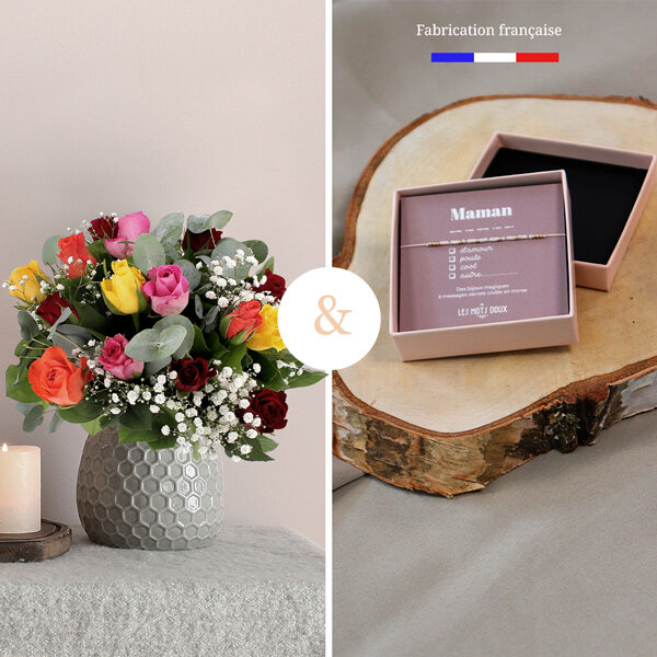 Bouquet composé de 15 roses multicolores accompagnées de gypsophile et d'eucalyptus en guise de feuillage, accompagné de son bracelet Les Mots Doux où les perles reprennent le code de l’alphabet morse pour traduire un message secret : Mamie. Bracelet fait à la main en France – Perles Miyuki 1mm – Taille ajustable (fermoir perle coulissante) – Résistant à l’eau.
