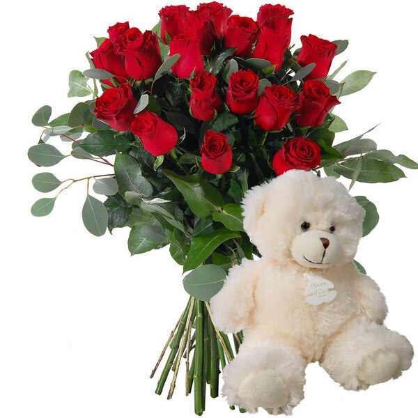 Le combo parfait pour la Saint-Valentin. Vingt roses rouges, l'emblème absolu de l'amour passionné, accompagnées d'un adorable ourson blanc signé Histoire d'Ours.