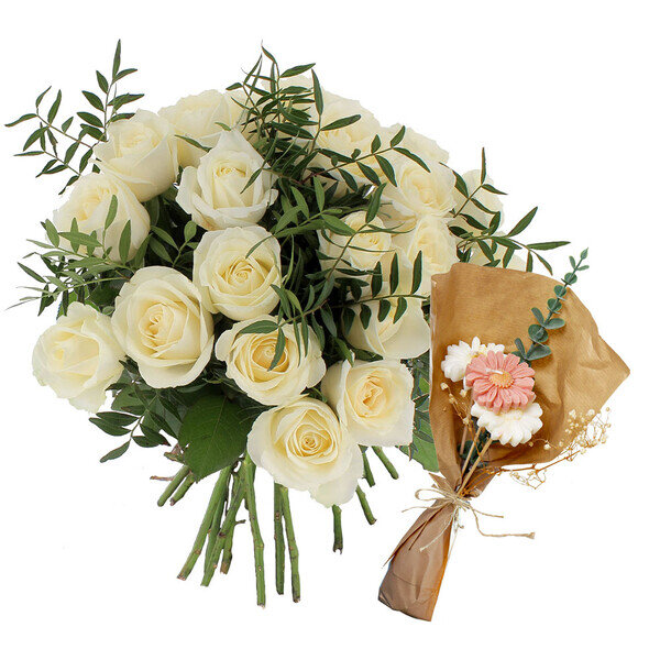 Pour ceux qui ne se lassent jamais des fleurs : vingt roses blanches accompagnées de trois bougies marguerites fabriquées à la main en France. Les roses apportent leur beauté le temps d'une semaine, puis les bougies prennent le relais avec leur parfum délicat qui dure bien plus longtemps.