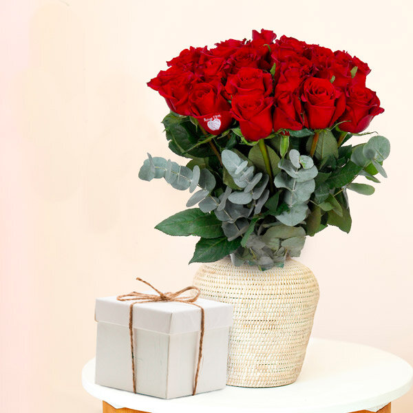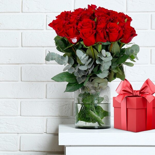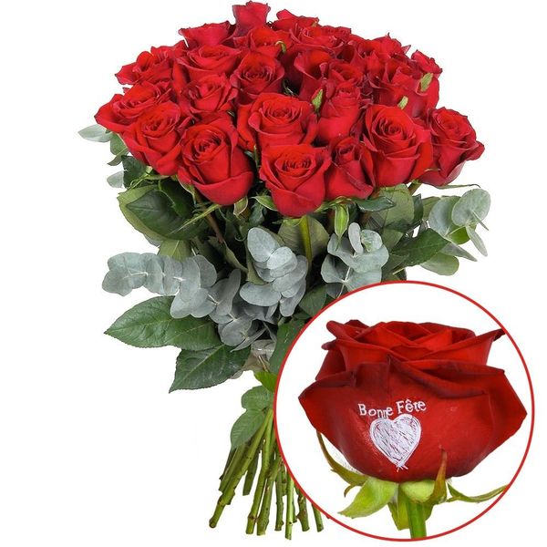 Bouquet de 24 roses rouges gros boutons (50cm), dont 1 rose marquée "Bonne Fête" (vase non compris).