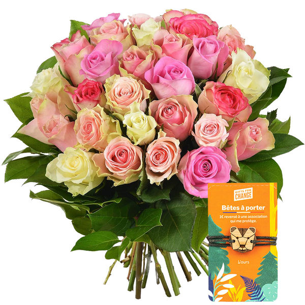 Ce luxuriant bouquet de 30 roses pastel sera le messager idéal de toutes vos émotions, tout en délicatesse et en toutes occasions. Son bracelet Gift for Change en faveur de l’association “AVES” qui protège les ours de la captivité.