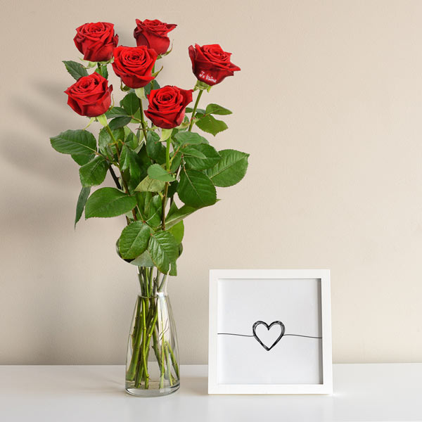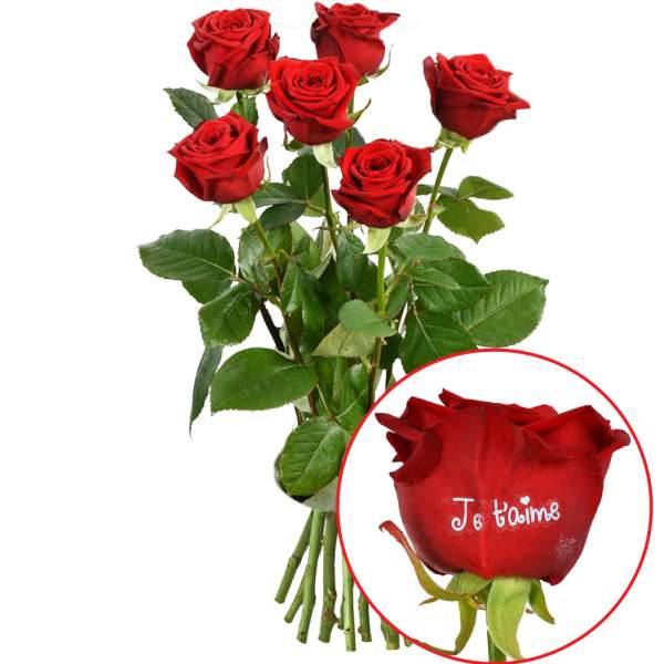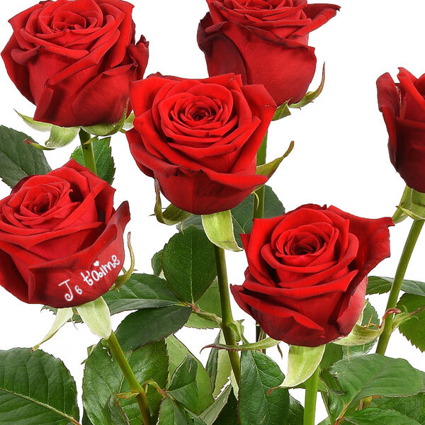 Bouquet de 6 roses rouges gros boutons (60cm), dont 1 rose marquée "JeT'aime".