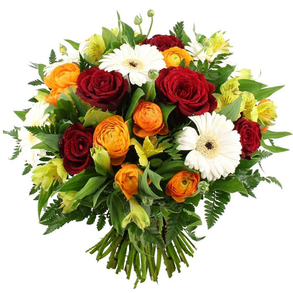 Bouquet rond dans les tons rouge, orange blanc, jaune et vert, composé de petites roses, germinis, fleurettes et feuillages.