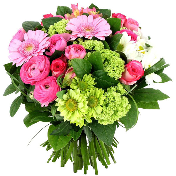 Bouquet rond dans les tons rose, blanc et vert composé de roses, germinis, chrysanthèmes et feuillages.