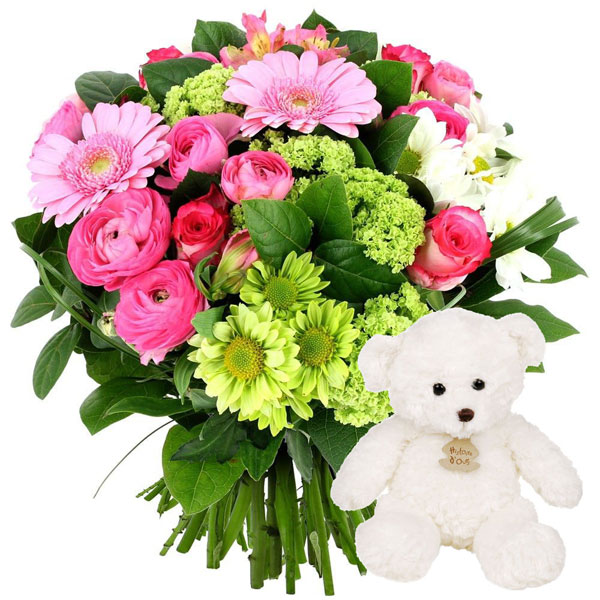 Bouquet rond avec roses et germinis dans les tons rose, vert et blanc, accompagné de son ourson en peluche (le type d'ourson dépend du fleuriste en charge de la livraison de votre commande).