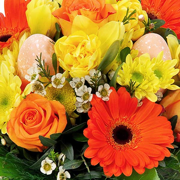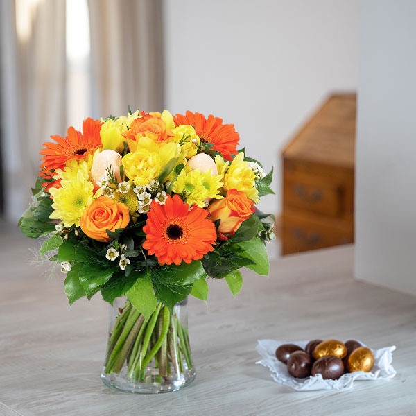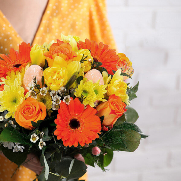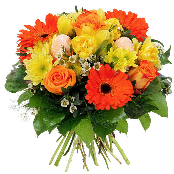 Bouquet de Pâques dans les tons orange et jaune composé de gerberas, roses et autres fleurs de saison avec des décorations de Pâques et du feuillage.