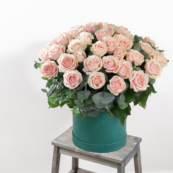 Bouquet rond dans les tons roses composé de roses et feuillages.