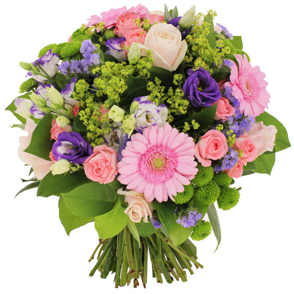 Bouquet rond dans les tons rose, fuchsia, violet et blanc composé de roses, gerberas, lisianthus fleurettes et feuillages.