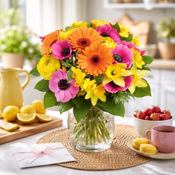 C'est un bouquet chaleureux sans en faire trop, lumineux sans être criard. Le genre de composition qui trouve sa place aussi bien sur une table de cuisine que dans un salon ou une entrée, et qui met de bonne humeur dès qu'on pose les yeux dessus. Exactement le type d'attention qui fait plaisir à recevoir un dimanche matin.