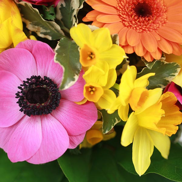 Bouquet dans les tons jaune, rose et orange, composé de jonquilles, gerberas, anémones et fleurs de saison, accompagné de divers feuillages.