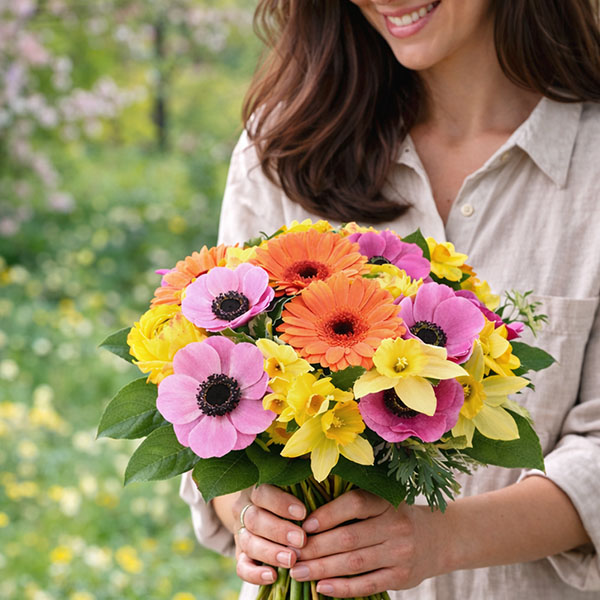 On y retrouve des jonquilles, des gerberas, des anémones et des renoncules, dans un camaïeu de jaune, de rose et d'orange qui s'accorde naturellement. Les jonquilles apportent ce petit éclat des premiers beaux jours, les gerberas relèvent l'ensemble avec éclat, et les anémones et renoncules viennent tout adoucir. Le feuillage varié donne du volume et un côté généreux très agréable à l'œil.