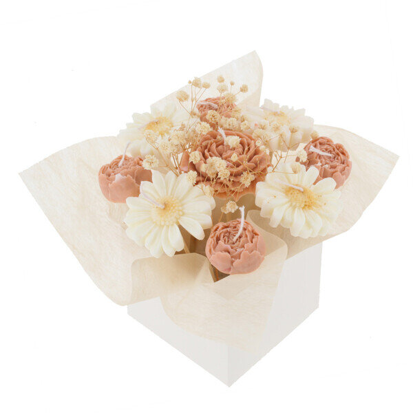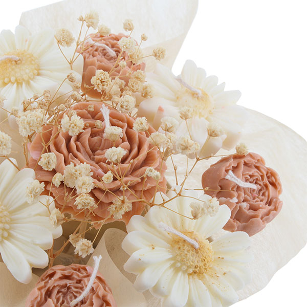 Bouquet de bougies en forme de fleurs. Composé de 4 petites pivoines corail, 1 grande pivoine corail et 4 marguerites blanches. Pour consumer la bougie, nous vous conseillons de la retirer de son pic et de la placer dans un récipient adéquat. Poids du bouquet : environ 230g