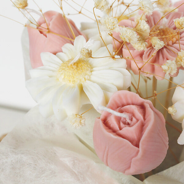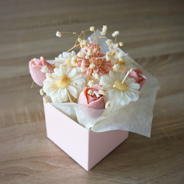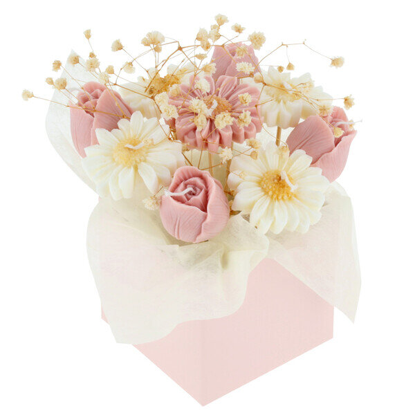 Bouquet de bougies en forme de fleurs. Composé de 4 tulipes roses, 1 marguerite rose et 4 marguerites blanches. Pour consumer la bougie, nous vous conseillons de la retirer de son pic et de la placer dans un récipient adéquat. Toutes les fleurs du bouquet sont senteurs fleur de coton Poids du bouquet : environ 220g