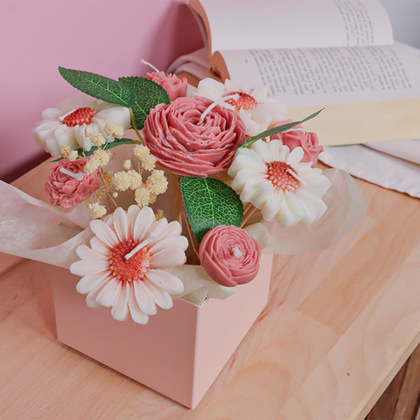 Ce bouquet ne ressemble à aucun autre. À première vue, c'est une composition florale classique : des pivoines roses généreuses, des roses tendres, des marguerites blanches et du gypsophile séché. Mais à y regarder de plus près : chaque fleur est une bougie, modelée à la main avec une précision qui trompe l'œil.