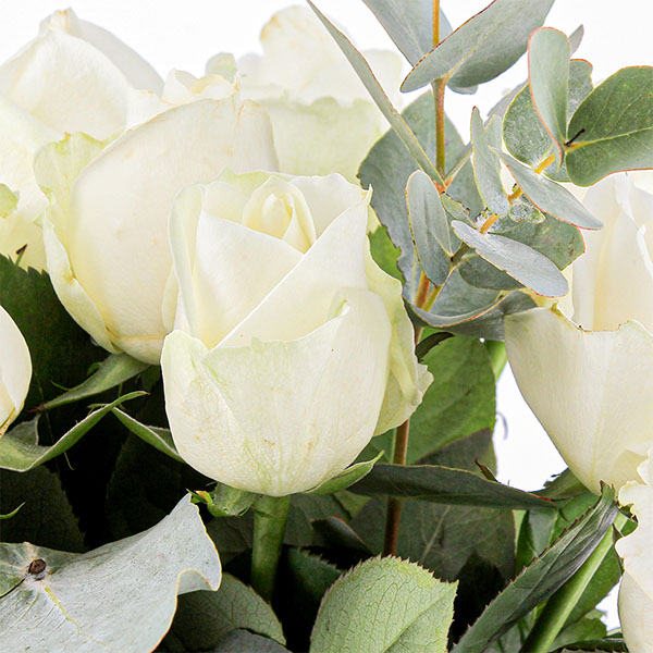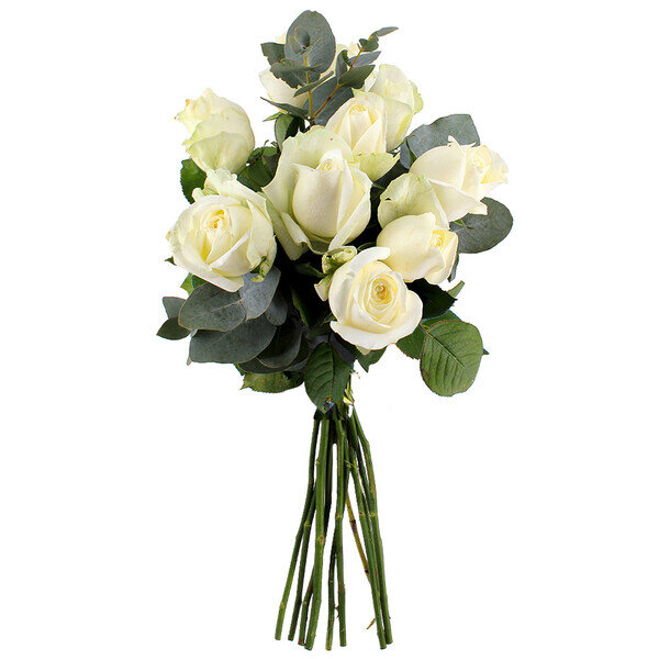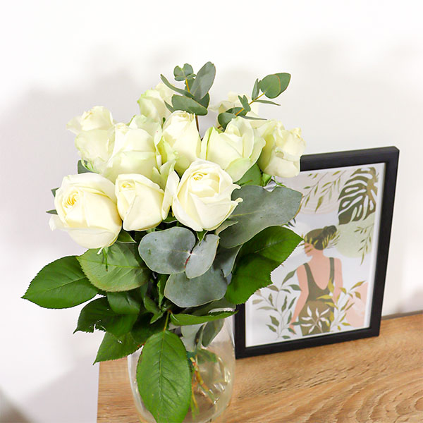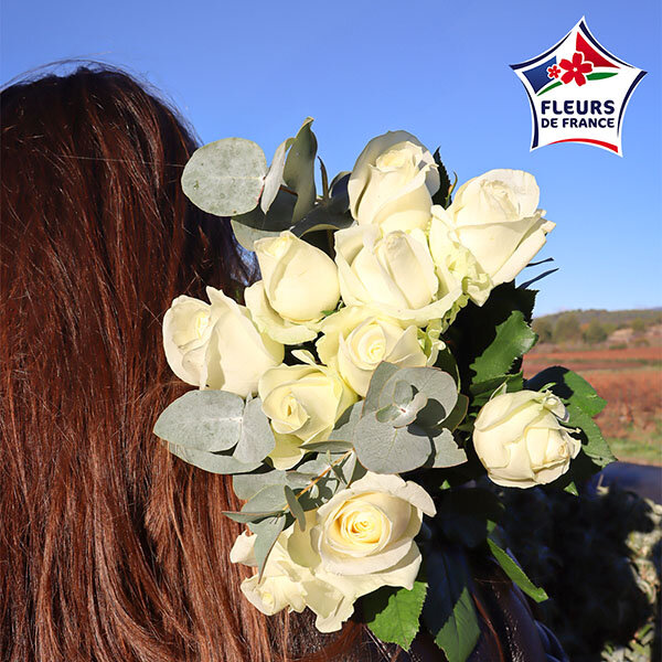 Des roses blanches françaises qui respirent la douceur. Ce bouquet rassemble 10 roses soigneusement choisies, accompagnées de quelques tiges d'eucalyptus grisé qui apportent une touche de verdure fraîche.