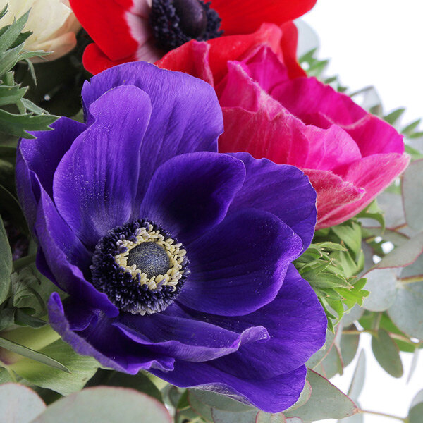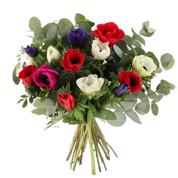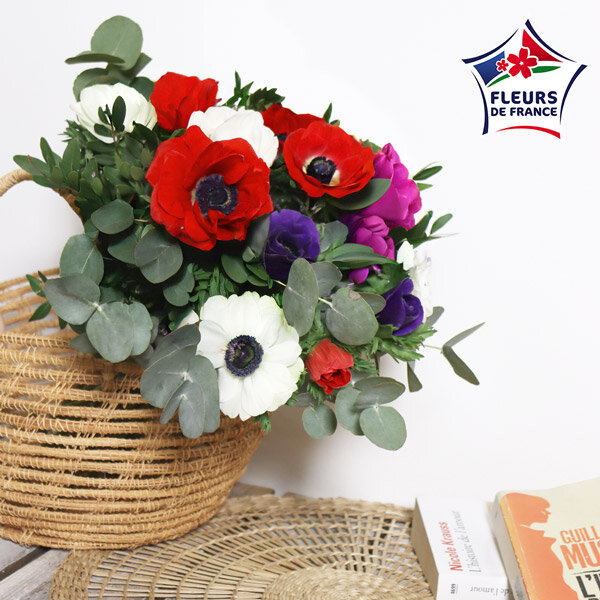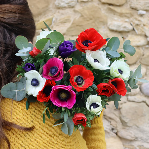 Bouquet composé de 15 tiges d'anémones de couleurs variées, 3 tiges de pistacia et 4 tiges eucalyptus. Les fleurs qui composent ce bouquet sont de production Française et possèdent le label Fleurs de France.