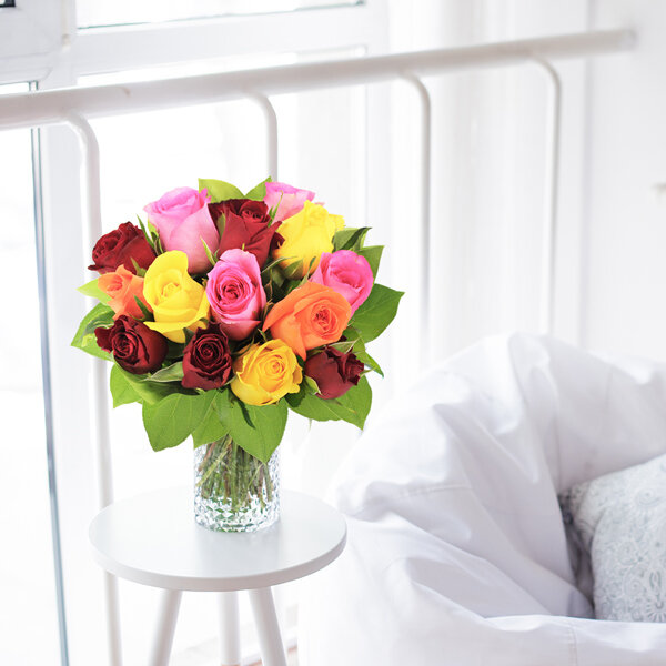 Optez pour une valeur sûre et soyez certain d’émerveiller vos proches avec ce sympathique bouquet de roses multicolores. Cette ravissante création florale, composée de roses multicolores, est une superbe manière de témoigner votre affection et votre sympathie.