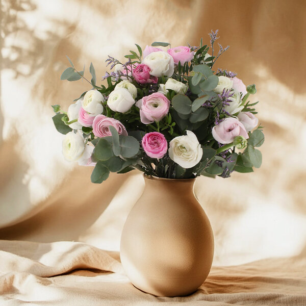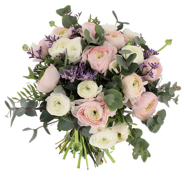 Joli bouquet composé de 20 renoncules roses pastel et blanches, 3 tiges de limonium, 3 tiges de pistacia et 4 tiges d'eucalyptus. Les fleurs qui composent ce bouquet sont de production Française et possèdent le label Fleurs de France.