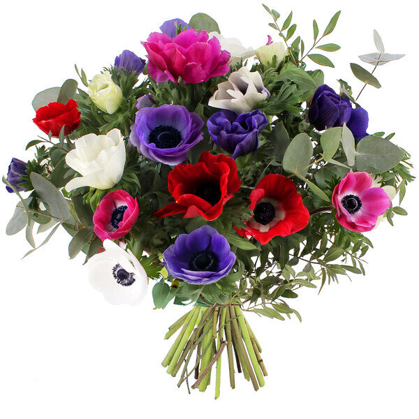Bouquet composé de 25 tiges d'anémones de couleur variées, 3 tiges de pistacia et 4/5 tiges eucalyptus. Les fleurs qui composent ce bouquet sont de production Française et possèdent le label Fleurs de France.