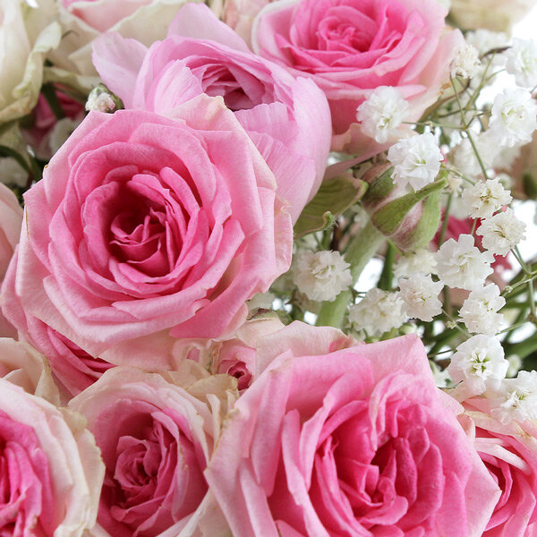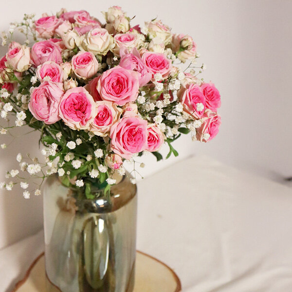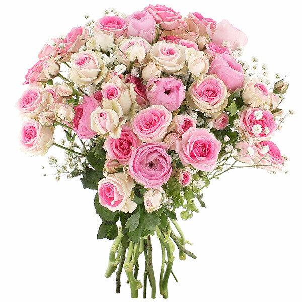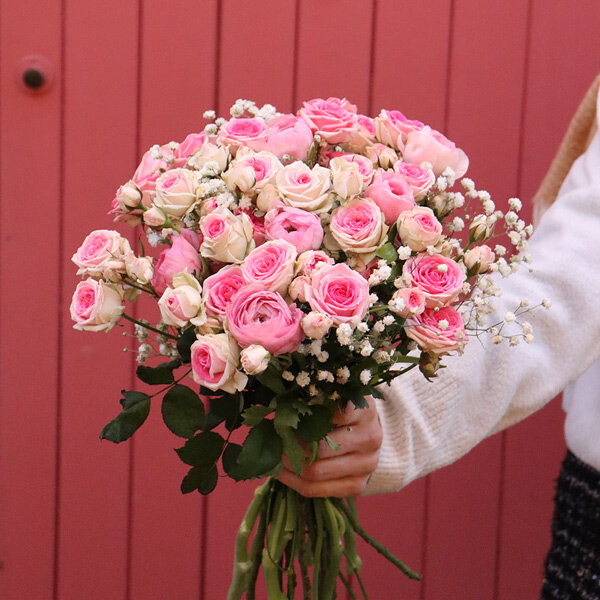 Au cœur de la composition : des renoncules roses, ces fleurs aux pétales serrés en couches infinies qu'on confond parfois avec les pivoines tellement elles ont du caractère. Elles sont accompagnées de roses Mini Éden, une variété appréciée pour sa longévité et son bouton bien formé, et de gypsophile qui allège l'ensemble sans le noyer dans les petites fleurs blanches façon "mariage des années 90" ; ici, c'est dosé, léger, juste ce qu'il faut.