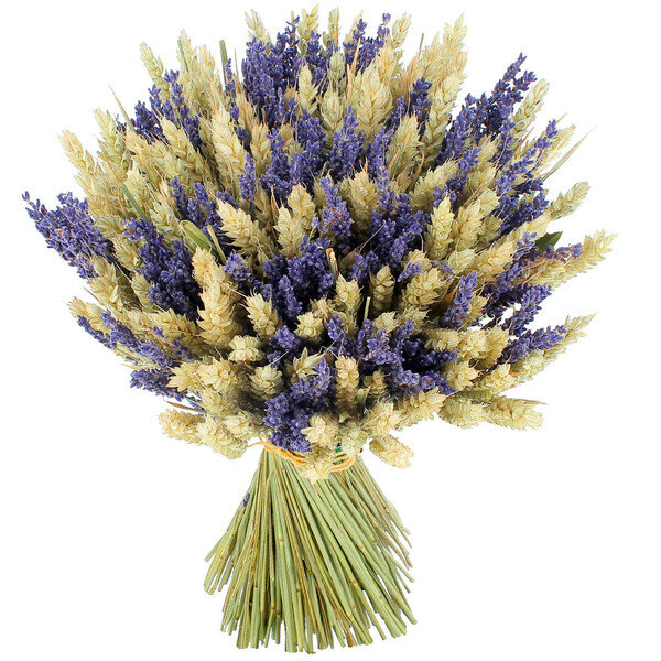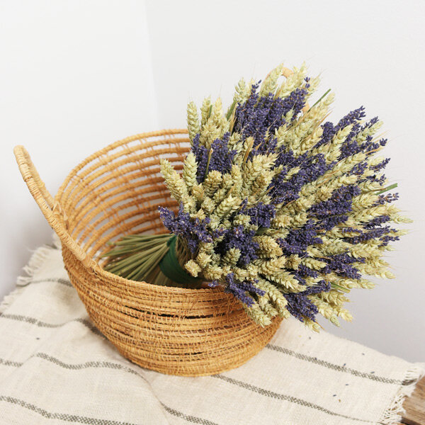 Fruit du travail de la terre et des hommes, ce prestigieux bouquet de fleurs séchées devient un véritable objet de décoration. Arborant les couleurs de l'été, cette composition symbolique enveloppe les intérieurs hivernaux d'une ambiance chaleureuse et ensoleillée, diffusant une fragrance délicate et naturelle. Le blé, symbole de fertilité et de richesse, entoure la lavande au bleu profond, exhalant son parfum caractéristique dans un bouquet haut en couleurs. Cette composition aux notes d’allégresse est parfaite pour toutes les occasions.