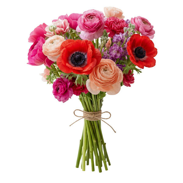 « Ce bouquet, c’est un vrai plaisir à composer. On travaille trois fleurs qu’on adore, chacune pour une raison différente : la texture des renoncules, le graphisme des anémones, la légèreté des fleurettes. On sélectionne les fleurs de saison le matin même pour créer une harmonie dans les tons rouge et rose. C’est typiquement le genre de création qui nous rappelle pourquoi on aime notre métier. »