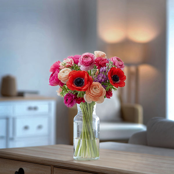 Entre rouge intense et rose délicat, les nuances se répondent et donnent du relief au bouquet. Le feuillage structure la composition tout en douceur, sans jamais l’alourdir.