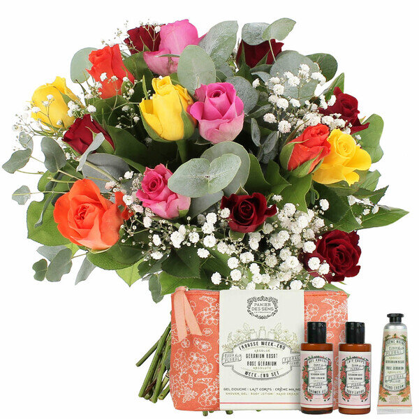 Bouquet composé de 15 roses multicolores, de gypsophile et d'eucalyptus, accompagné de sa trousse de voyage à la senteur Géranium Rosat, composée d'un gel douche (70 ml), d'un lait corps (70 ml), et d'une crème mains 30 ml.