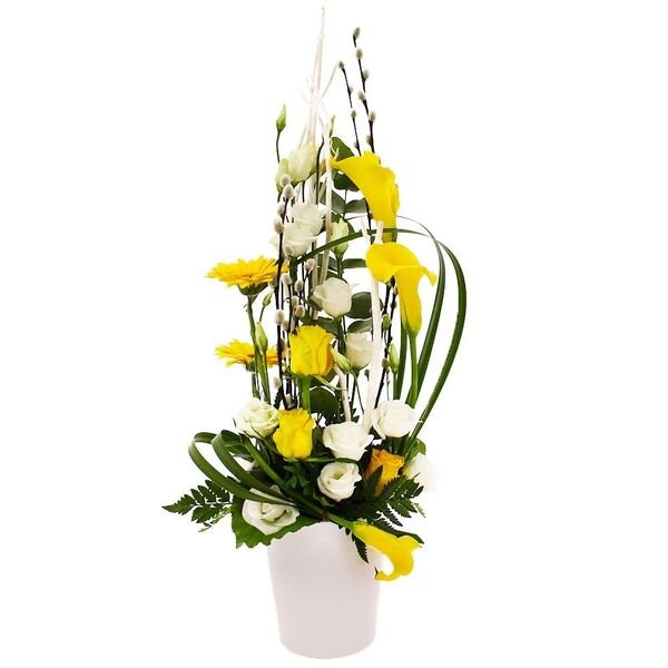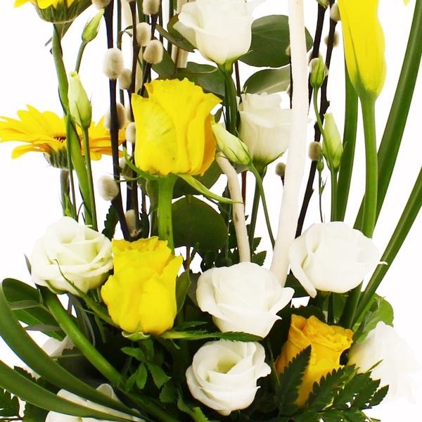 Composition spéciale fête des grands-mères dans les tons jaune et blanc composée de roses, germinis et autres fleurs de saison.