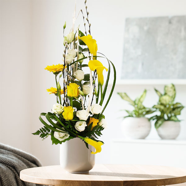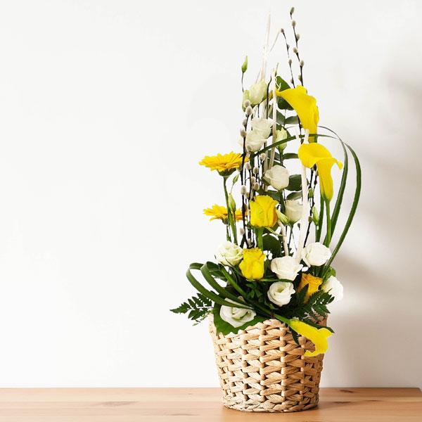 Votre arrangement floral Florajet, composé de fleurs fraîches, pourra être quelque peu différent du visuel présenté qui a valeur indicative. Votre composition, créée spécialement pour vous par un de nos artisans, est susceptible de varier légèrement en fonction de la sensibilité artistique du fleuriste mais aussi de la saisonnalité des fleurs qui la composent. L'esprit du bouquet, sa forme, ses couleurs ainsi que ses essences principales seront respectés par notre artisan fleuriste qui réalisera, à votre intention, cette création inédite quelques minutes avant de la livrer.