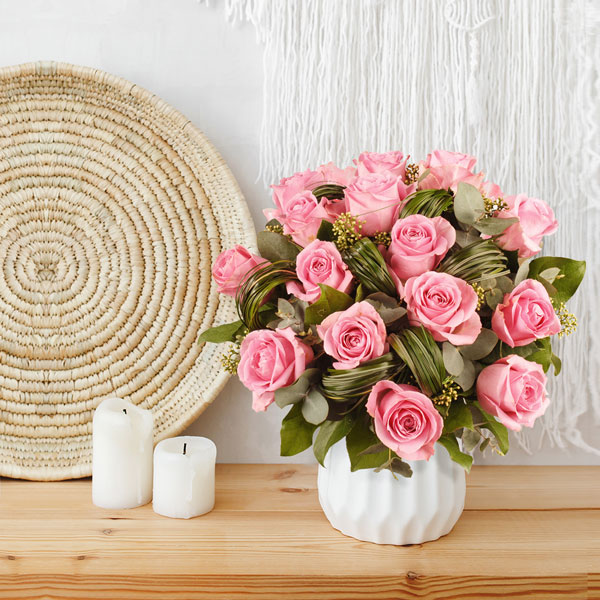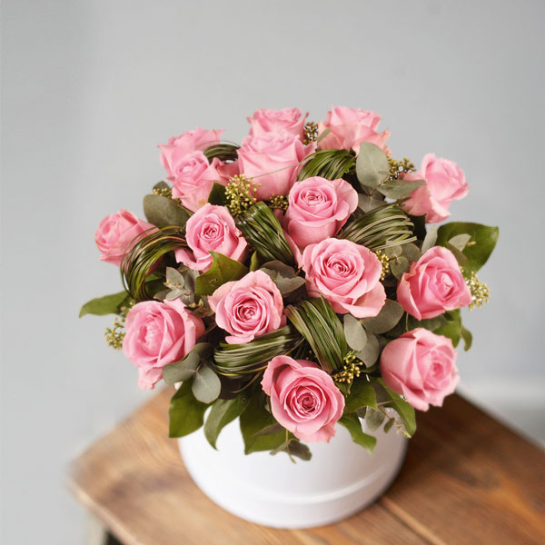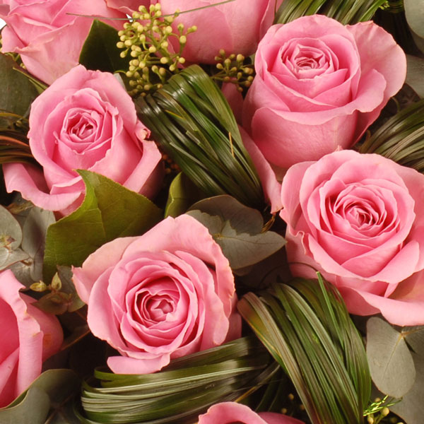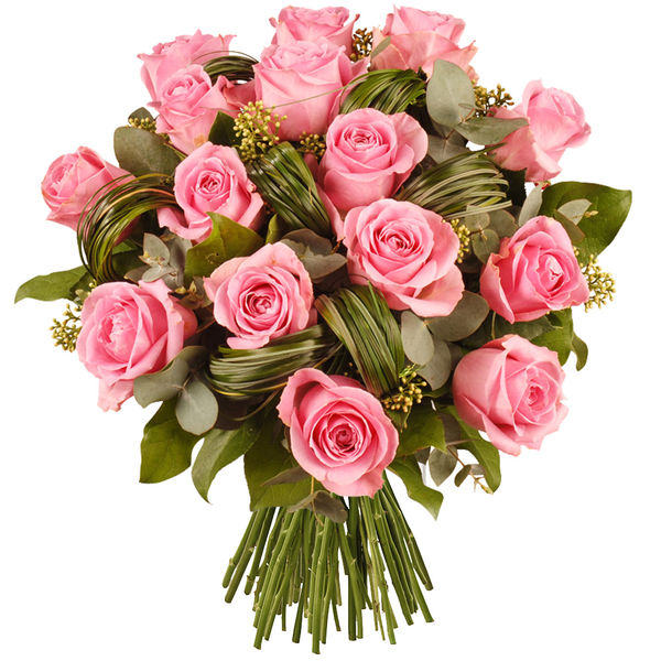 Bouquet rond composé de roses roses, beargrass retourné et autres feuillages skimmia, eucalyptus, salal... La variété et la période peuvent faire varier le prix des roses. Ainsi, pour un tarif affiché, un bouquet de roses peut être composé d'un nombre différent de tiges.