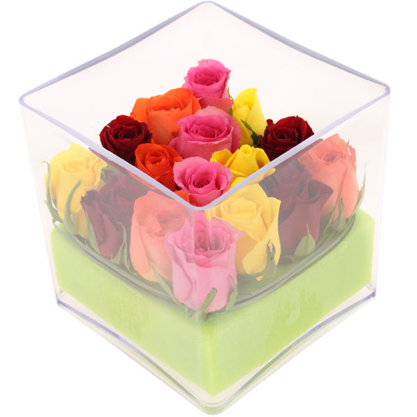Composition piquée réalisée à partir de mousse verte et de 16 roses multicolores avec un travail de feuillage, le tout dans contenant carré en plexiglass.