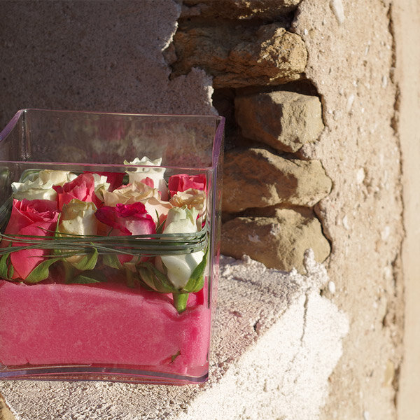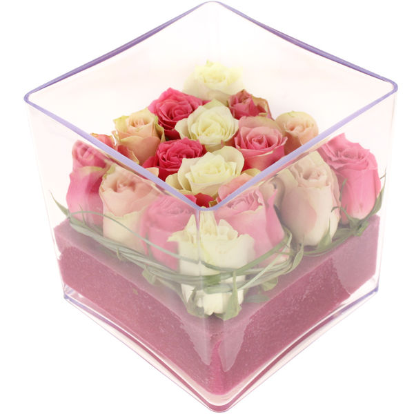 Composition piquée réalisée à partir de mousse rose, de 16 roses pastel avec un travail de feuillage, le tout dans contenant carré en plexiglass.