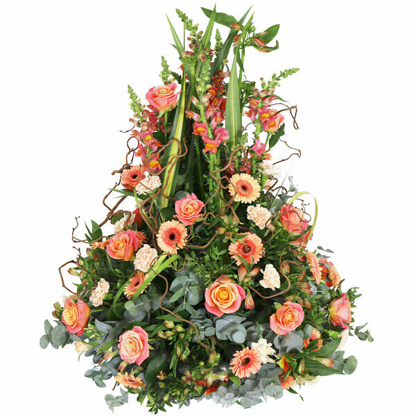 Coussin conique saumon composé de roses, germinis, muflier, fleurettes et feuillages.