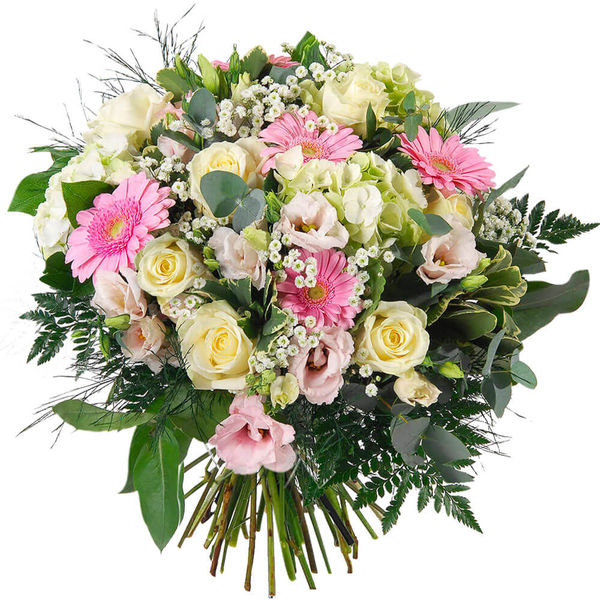 Bouquet rond dans les tons rose pâle, blanc et vert composé de roses, germinis, lisianthus, gypsophile et feuillages.