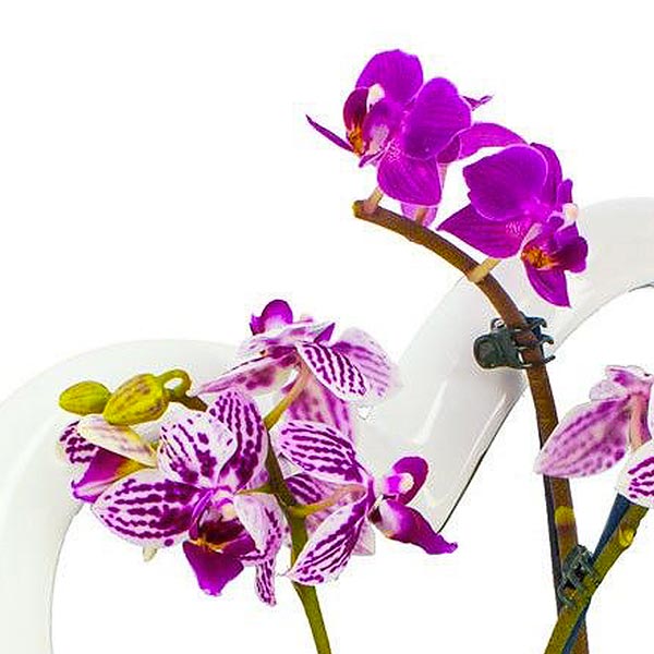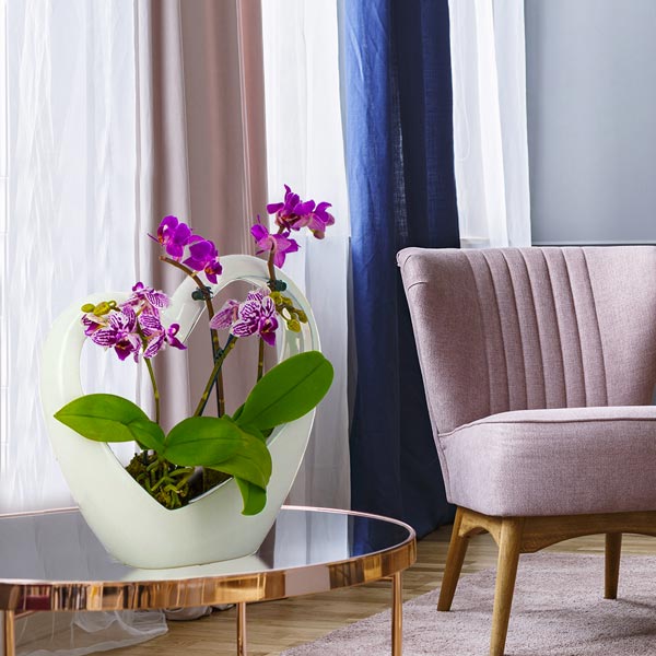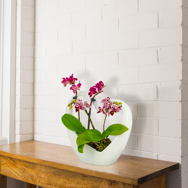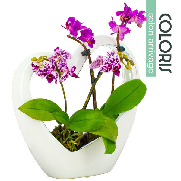 Cœur en céramique blanc de 25cm contenant deux mini-orchidées dont la couleur varie en fonction de l'arrivage (afin de vous assurer un produit de qualité, l'orchidée ne voyage pas dans son cœur en céramique).