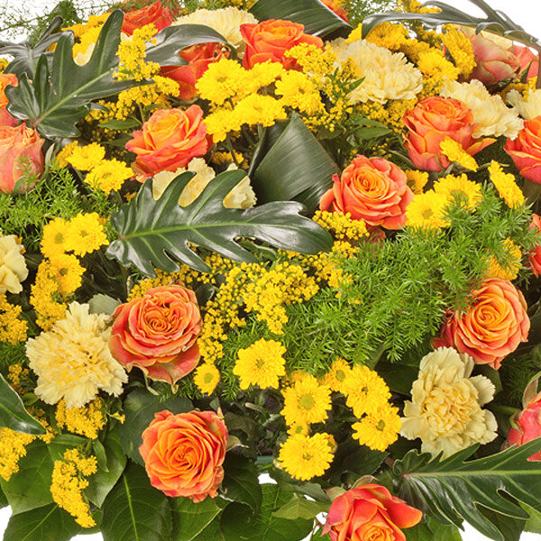 Coussin de deuil dans les tons orange, beige et jaune composé de roses, santini, œillets beige et autres végétaux.