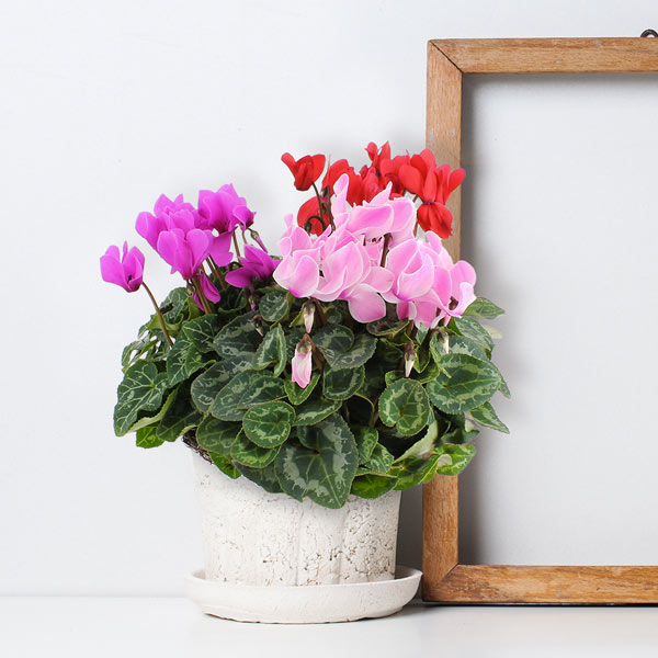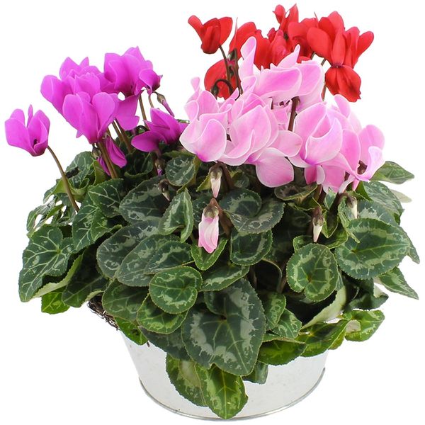 Coupe de cyclamens rouge, rose et mauve dans une coupe dans les tons beige (le contenant peut varier en fonction des disponibilités).