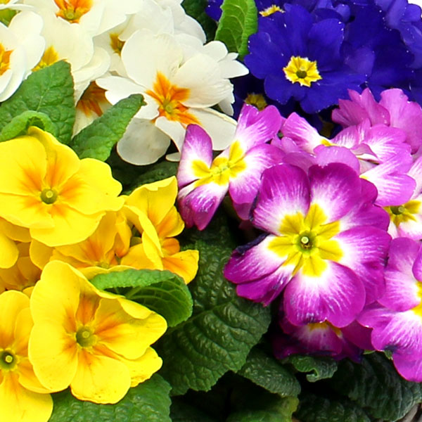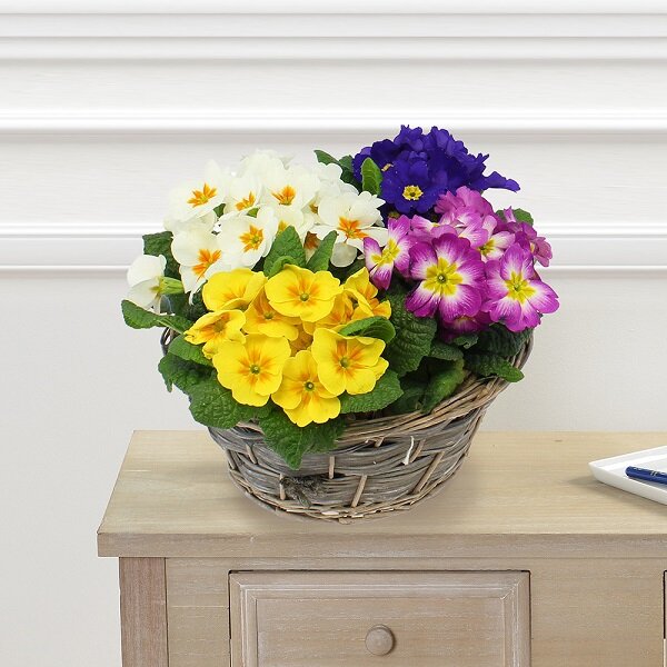 Coupe de primevères, aux coloris variés (le contenant et les couleurs des primevères peuvent varier en fonction des disponibilités du fleuriste en charge de votre commande).