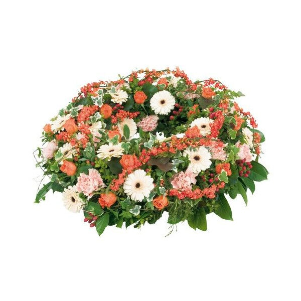 Couronne plate dans les tons d'orangen rouge et crème composée de germinis, roses , œillets orange pale et autres fleurs de saison.