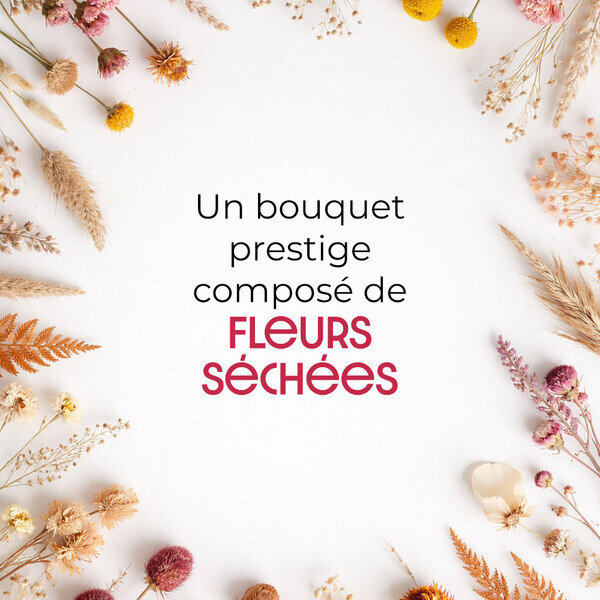 Votre artisan fleuriste réalisera un bouquet prestige de fleurs séchées en fonction de la touche artistique qui lui est propre et de la tendance du moment. Le visuel présenté est non contractuel.