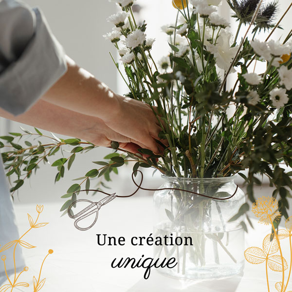 Votre arrangement floral sera créé spécialement pour vous par l’un de nos artisans fleuristes en fonction de sa sensibilité artistique et selon la saisonnalité des fleurs dont il dispose. De ce fait, votre création pourra être différente du visuel non-contractuel présenté, même si le thème artistique devra être respecté. Enfin, votre commande florale ne sera réalisée que quelques minutes avant d’être livrée à son destinataire, par souci de qualité et de fraîcheur optimale.