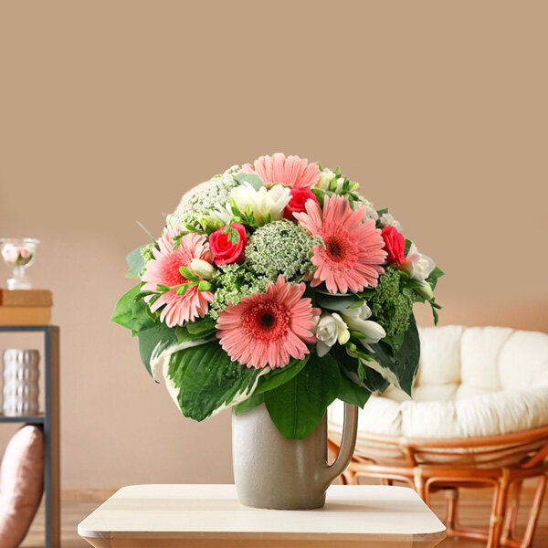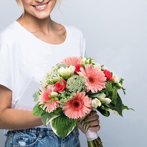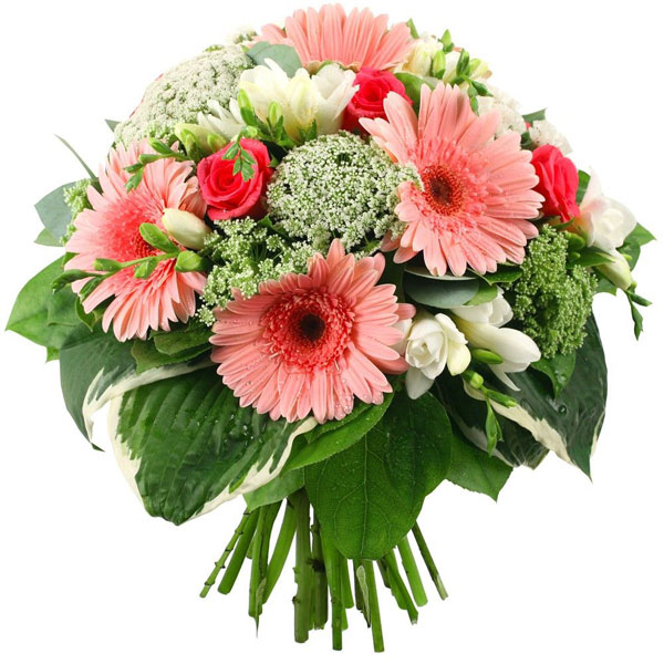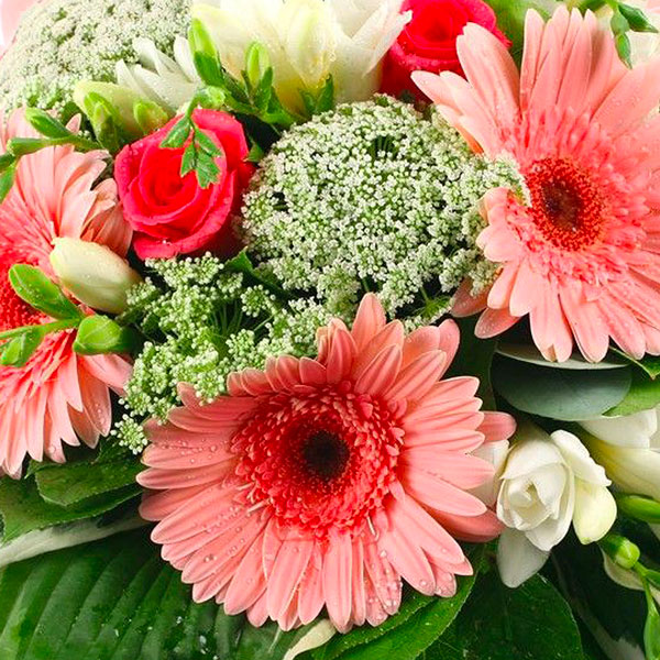 Bouquet rond dans les tons rose, blanc et vert composé de roses, gerberas, freesias et feuillages divers.