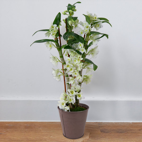 Le Dendrobium blanc séduit par son allure graphique et raffinée. Ses tiges élancées, évoquant le bambou, portent des grappes de fleurs blanches qui lui donnent une silhouette structurée et élégante. Installé dans son pot en zinc taupe, il trouve naturellement sa place sur une étagère, un bureau ou un rebord de fenêtre. Avec une hauteur comprise entre 45 et 50 cm, il affirme sa présence tout en restant harmonieux au sein de votre intérieur ou celui de votre destinataire.