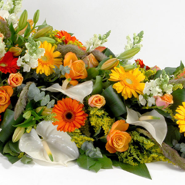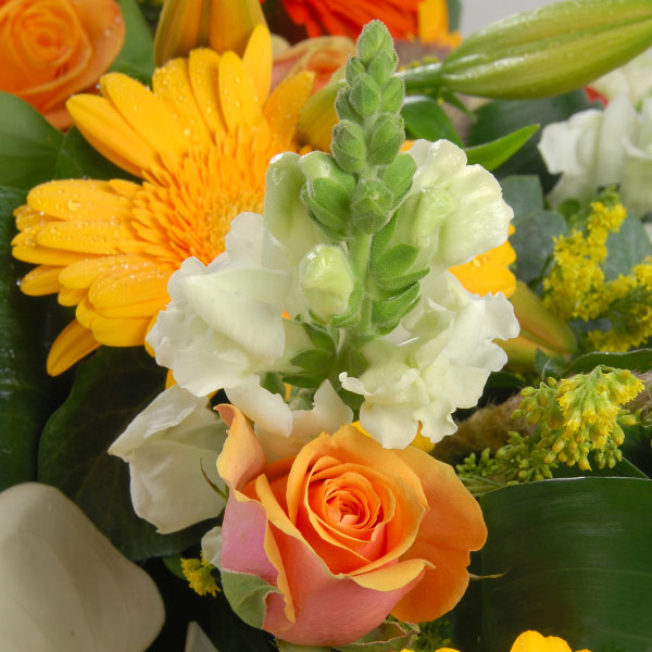 Gerbe de deuil dans les tons jaune et orange composée de lys, roses, gerberas, le tout accompagné de feuillages.