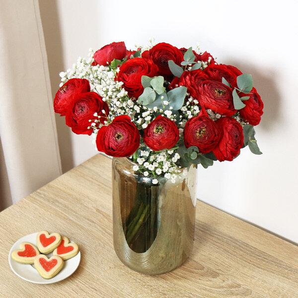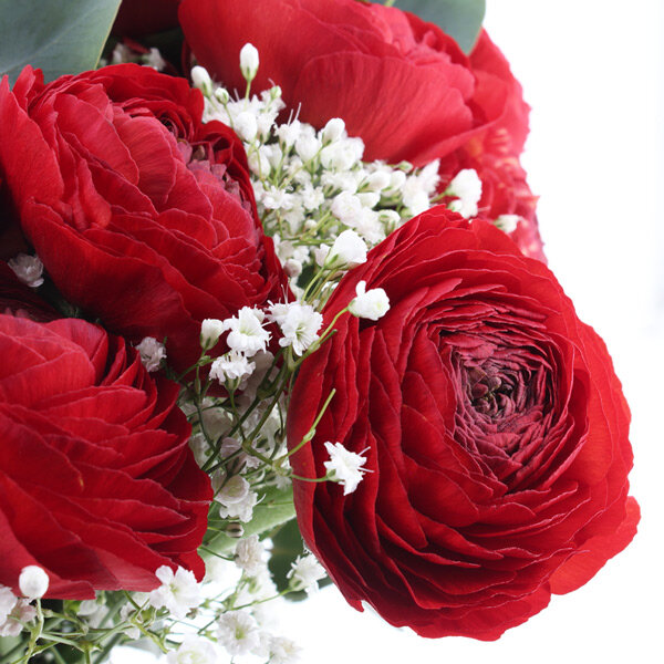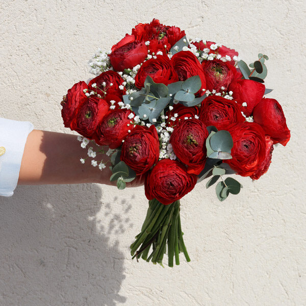 Le rouge des renoncules a quelque chose d'hypnotique. On pourrait les fixer des heures, se perdre dans leurs pétales qui se déploient comme de la soie froissée. Le gypsophile blanc vient adoucir l'ensemble, créer du contraste, rappeler que les plus beaux sentiments ont aussi leur part de légèreté.