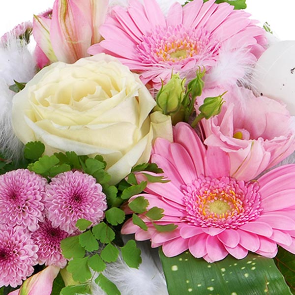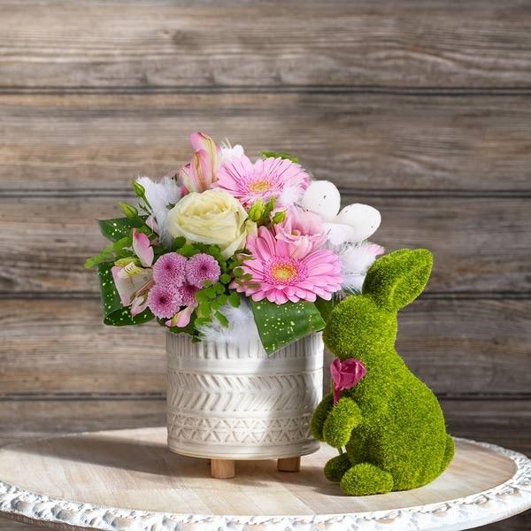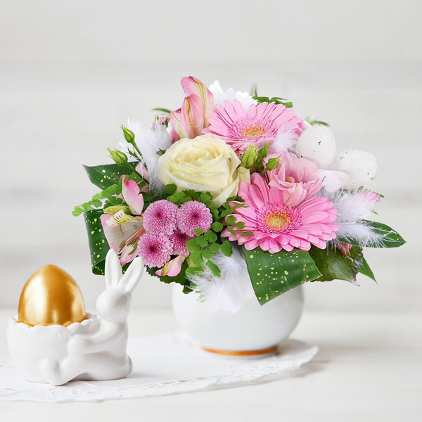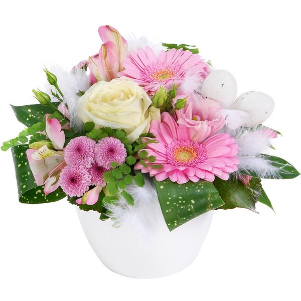 Composition piquée rose et blanche spéciale Pâques composée de germinis, alstroemerias, santinis, feuillage et décorations de Pâques. Le contenant peut varier en fonction des disponibilités chez le fleuriste.