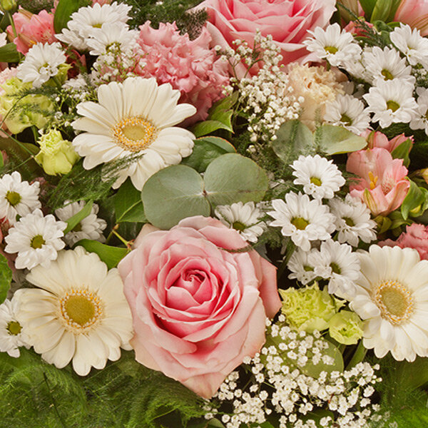 Grande composition de deuil dans les tons rose pâle, blanc et vert composée de roses rose clair, alstromérias, germinis blancs, lysianthus et d'autres fleurs dans un panier en osier sans anse (contenant non contractuel).